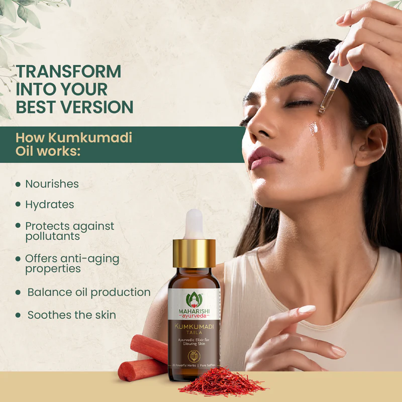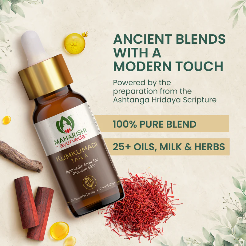 Reveal radiant, glowing skin with Maharishi Ayurveda Kumkumadi Tailam, the best Kumkumadi oil for face. This luxurious Ayurvedic face oil combines saffron, herbs, and natural oils to reduce pigmentation, nourish skin deeply, and enhance your Natural glow.