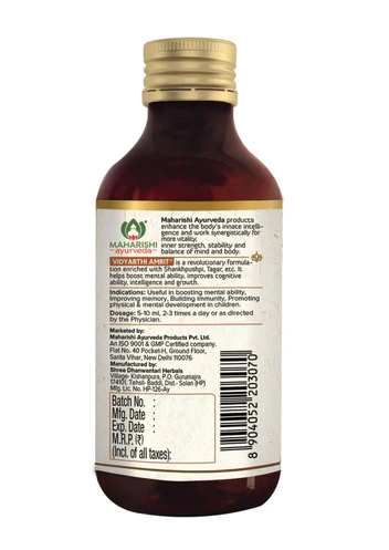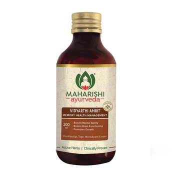 Vidyarthi Amrit is a tonic that aims to improve memory, boost the nervous system, strengthen immunity, and promote mental and physical development in students. It includes rejuvenators to enhance intelligence, prevent mental fatigue, and support sustained intellectual activity. The formulation comprises a blend of natural ingredients known for their cognitive benefits and overall health support.